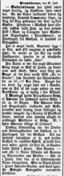 Pirupshvarre den 27 Juli 1898. Badesæsonen har hidtil været meget dårlig og Gjæsterne have været få. Nu har Vejret imidlertid bedret sig betydeligt. Vandets Temperatur stiger og Dag for Dag ankommer der flere og flere Gjæster. Hotellerne i Blokhus have allerede næsten fuldt Hus og flere private Folk i Byen og Omegnen have Gjæster. Hos Sognefogden i Pirupshvarre, en Fjerdingvej fra Blokhus er således 10 Badegjæster. Her er meget smukt, Gårdene ligger i en Dal, mod Øst omgivne af grønklædte Høje, de minde en Del om norske Fjældpartier hvorfor de af tilsejlende Nordmænd ere døbte Lien. Fra Dalen er der kun nogle Minutters Gang langs en Bæk til Havet og drejer man mod Nord støder man straks på Vraget af det store norske Skib ”De tre Venner” som strandede her Nytårsaften for en 16-17 År siden. Vraget har nu boret sig meget dybt ned i Sandet men en Del af det rager endnu op over Sandfladen og er synlig i stor Afstand. I Mandags havde Pirupshvarre Besøg af Børnene fra Jetsmark nordre Skole, i alt ca 30 Vogne. Alle Børnene bleve hos Sognefogden trakterede med Kaffe hvorefter man foretog små Udflugter og derefter svingede sig i Dansen til Musikkens Toner, medens man jævnlig aflagde de medbragte Madkurve et Besøg. Kl 7 kjørte Børnene tilbage til Jetsmark. Tirsdag Eftermiddag var der Øvelse med Redningsbåden ved Rødhus, ca 3 Fjerdingvej syd for Blokhus. Det var særdeles interessant at se med hvilken Raskhed de vejrbidte Søfolk af hvilke flere vare ældre gjorde alt klar til at Båden kunde flyde i Havet. Idet Båden med alle 10 Roere siddende ved Årerne og Styrmanden på Pladsen flød ud i Havet blev den af en tilstedeværende dame fotograferet. Efter en Times Øvelse i Havet stævnede Båden mod Land igjen. En Mængde Mennesker overværede Øvelserne.