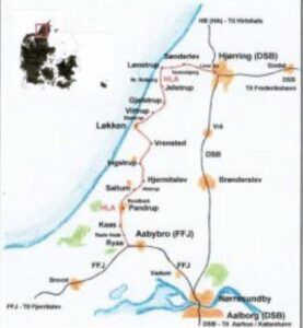 eksisterede på strækningen fra Hjørring til Aabybro. Desuden havde vi i Vrensted rutebilforbindelsen Løkken – Brønderslev. Det gav os fin mulighed til en forbindelse både til det nordlige Vendsyssel og længere væk hvis man skulle længere. På det tidspunkt indtil til sidst i 1950erne var bilen jo ikke allemandseje. Desuden blev banen også brugt til godstransport til de små stationer, og ikke mindst Briketfabrikken i Moseby benyttede sig af banen til transport af tørv og briketter.